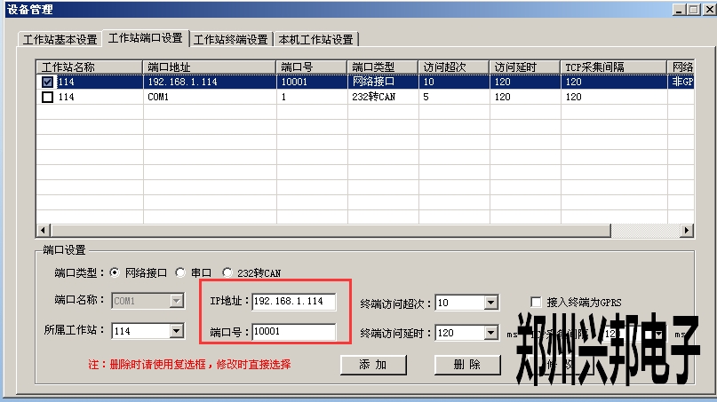 軟件中在工作站端口設置中,端口類型要選擇‘網絡接口’,IP地址一欄要輸入本機電腦的IP地址(不是消費機的IP地址),端口號一欄要輸入配置模塊IP時設置的遠程端口號,如下圖所示,然后點擊添加即可
