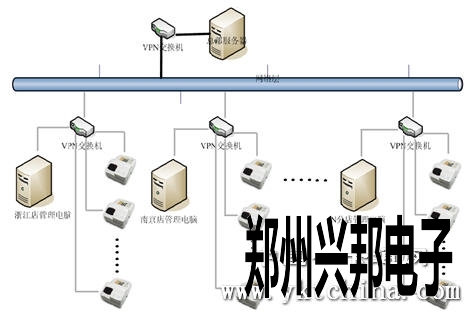 如上圖所示,把整個系統的管理電腦納入到VPN局域網絡中來,使各家分店和總部服務器之間的通訊無地理的局限,實現整個系統數據的實時交換。